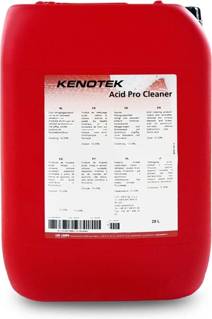 ACID PRO CLEANER to wysoko skoncentrowany, kwaśny preparat do skutecznego usuwania osadów mineralnych, pyłu hamulcowego oraz zanieczyszczeń z powierzchni aluminiowych i felg. Nie zawiera fluorków ani kwasu solnego, dzięki czemu jest bezpieczny nawet dla polerowanego aluminium – idealny do czyszczenia zbiorników paliwa, felg oraz elementów ciężarówek, autobusów i maszyn przemysłowych.